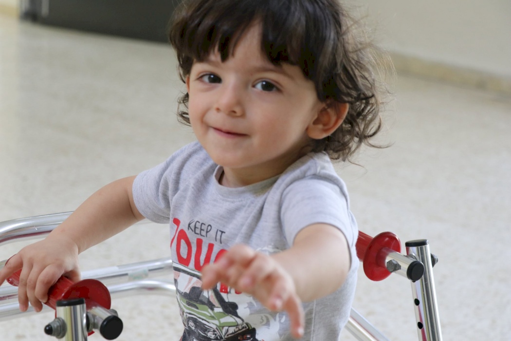 Kinan, now two years and four months old, was diagnosed with a physical disability and referred to the Child Rehabilitation Centre at the Jerusalem Princess Basma Centre. His first admission was at the age of one year and eight months.